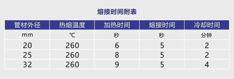 將熱熔器加熱至260℃(請注意嚴禁超過265 ℃),迅速將水管及接頭無旋轉地同時推入熱熔頭加熱,熱熔時間見附表。